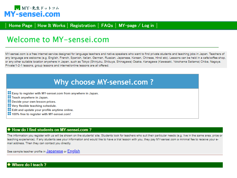 Ở những vùng đô thị như Tokyo, Osaka,… không quá khó để trở thành một giáo viên giảng dạy tự do. Bạn hãy đăng ký tài khoản của mình ở một Web, ví dụ như MY- sensei.com, cho phép đăng ký miễn phí.