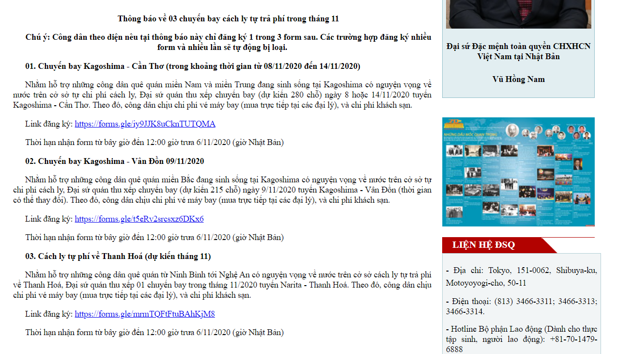 Nhằm hỗ trợ những công dân quê quán từ Ninh Bình tới Nghệ An có nguyện vọng về nước trên cở sở cách ly tự trả phí về Thanh Hoá, Đại sứ quán thu xếp 01 chuyến bay trong tháng 11/2020 tuyến Narita – Thanh Hoá. Theo đó, công dân chịu chi phí vé máy bay (mua trực tiếp tại các đại lý), và chi phí khách sạn.
