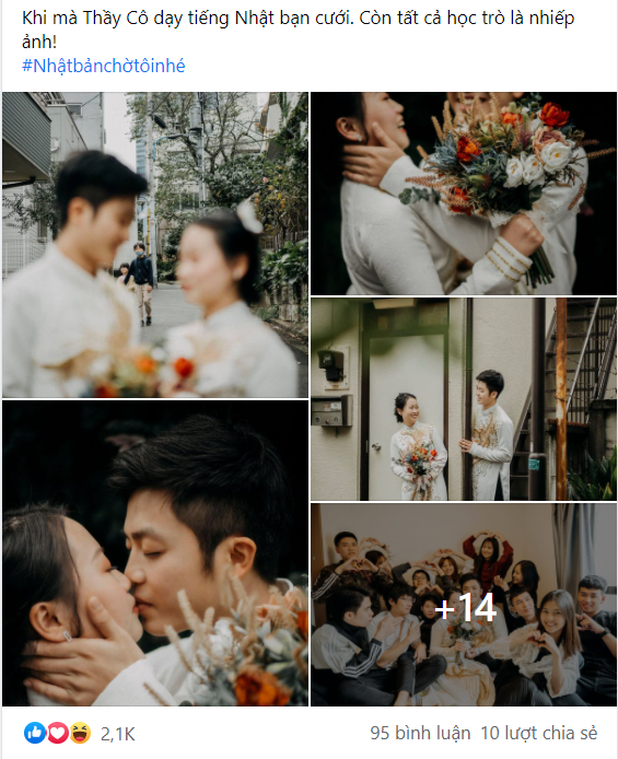 Thầy Cô dạy tiếng Nhật bạn cưới. Còn tất cả học trò là nhiếp ảnh! Đây là bộ ảnh nhận được nhiều sự quan tâm đến từ cộng đồng Nhật Bản chờ tôi nhé. Chỉ trong thời gian ngắn bộ ảnh đã cán đích hơn 2000 like, đạt top những bài tương tác trong group