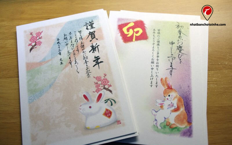 Những tấm thiệp xinh xắn được viết bằng tay. Được in hình những con giáp ngộ nghĩnh hay những biểu tượng như núi Phú Sĩ, hoa Anh Đào. Thiệp chúc mừng cần được viết và gửi đi từ trước ngày 31/12 . Bên vận chuyển của bưu điện sẽ phân loại, sắp xếp, và chuyển phát tới người nhận vào đúng sáng ngày 1 Tết. Thật thú vị phải không nào!