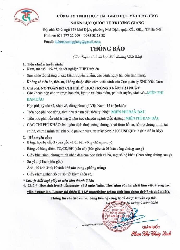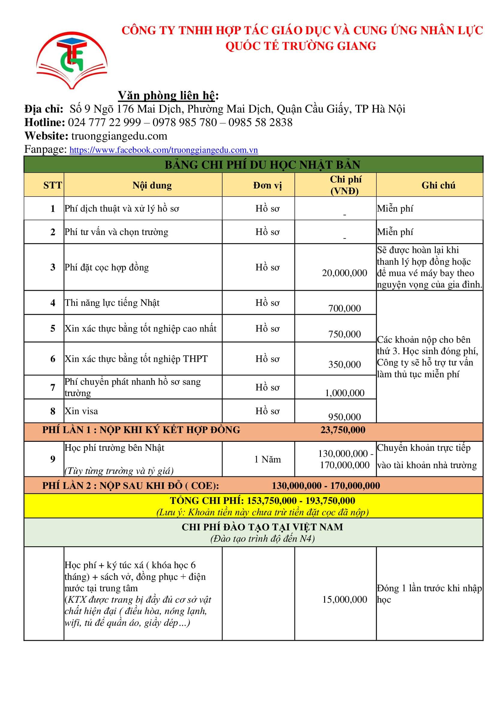 Liên hệ: Công ty TNHH hợp tác giáo dục và cung ứng nhân lực quốc tế Trường Giang